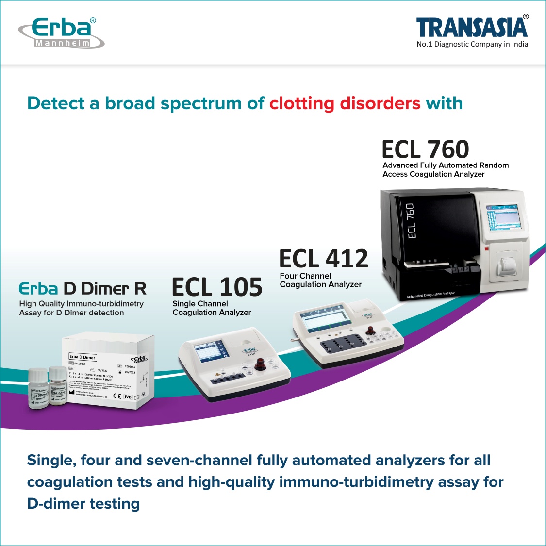 Transasia Bio-Medicals Ltd.’s range of products for detecting coagulation disorders, including Erba D-dimer R and ECL range of fully and semi-automated coagulation analyzers, ECL 760, ECL 412, and ECL 105, offer early detection of clotting disorders. These analyzers are advanced systems, which redefine existing products in the marketplace. These systems have interactive displays, built-in printers, RFID, cuvette and reagent management systems, elaborate Quality Control software, and up to 6-point multi-standard curve features. These features allow the system to perform various coagulation tests on a semi-automated platform.