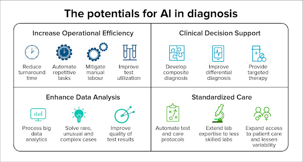 The integration of AI with the conventional modes of diagnosis, opens up a plethora of opportunities like enhancing lab workflow efficiency, predictive maintenance, inventory management, remote access, etc.: