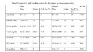 Patients on steroids or immuno-suppressant with known autoimmune disorders were excluded. Children <1 year of age, due to the possible presence of maternal antibodies, children displaying signs of altered consciousness at the time of recruitment, as well as children with nephrotic syndrome or obesity (body mass index 32), were also excluded. Another 50 patients (mean age of 8.92 ± 0.41) were selected randomly, for known diseases presenting with short-term fever (lower respiratory tract / upper respiratory tract infections) within seven days of onset. In these patients, the diagnosis of dengue was excluded by establishing other confirmed diagnoses.
