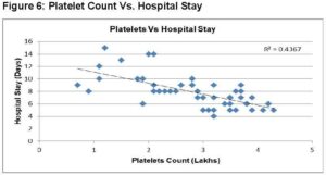 Results of the present study showed that hospital stay duration increased with an increase in serum Ferritin level Mean hospital stay for the patients was 7.9 ± 2.5 days, and ferritin (p<0.05). The more the serum ferritin levels more is the time required by the patient to recover. Thus, serum ferritin can be considered as an indicator of the severity of illness. Serum ferritin levels can be used to predict the course of the disease or prognosis. That is, if the patient is screened for serum ferritin, these levels can guide us about the future course of the patient. Based on ferritin levels, patients need careful monitoring to avoid complications. [7] Similar results were obtained in a study conducted on children where it was observed that increased serum ferritin was associated and well-correlated with the severity of dengue. [3, 11, 6] A similar study from Indian subcontinent also correlated the raised serum ferritin with the severity of the disease. [17] This shows that serum ferritin can be used as an early marker of the illness and its severity.
