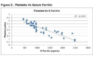 There were no differences between the two groups with regards to age and sex. The results obtained were analyzed using appropriate statistical software. Descriptive statistics were reported as mean ± Standard deviation (SD), median with a coefficient of variation. Mann Whitney U test was used to compare platelet count and serum ferritin between case and control groups. Spearman’s rank correlation was used to assess the correlation between age with platelet count, lipid profile, serum ferritin, and hospital stays. A P-value of less than 5% was considered statistically significant.