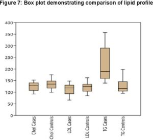 In dengue cases, as Ferritin increases, platelet count decreases. This is an ominous sign in dengue infection prognosis. A similar correlation (Figure 6) has been observed in cases among serum Ferritin and serum LDL with a correlation coefficient of -0.930. Serum cholesterol has a strong positive and negative correlation with Platelets (figure 4, R = 0.846) and serum Ferritin (figure 5, R = 0.838) respectively. Figure 7 shows the correlation between the platelet count and hospital stay, which is a strong negative. As platelet count increases, a good prognostic marker, hospital stay duration decreases. Figure 8 shows the box plot distribution of triglycerides, total cholesterol, and low-density lipoproteins. Box plots demonstrate 95% CI for comparison between the lipid profile of cases and controls. Mean TG levels were higher in cases than in controls (p-value < 0.05). Mean LDL and cholesterol levels were lower in cases than in controls. (P-value = 0.04).